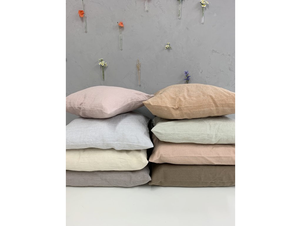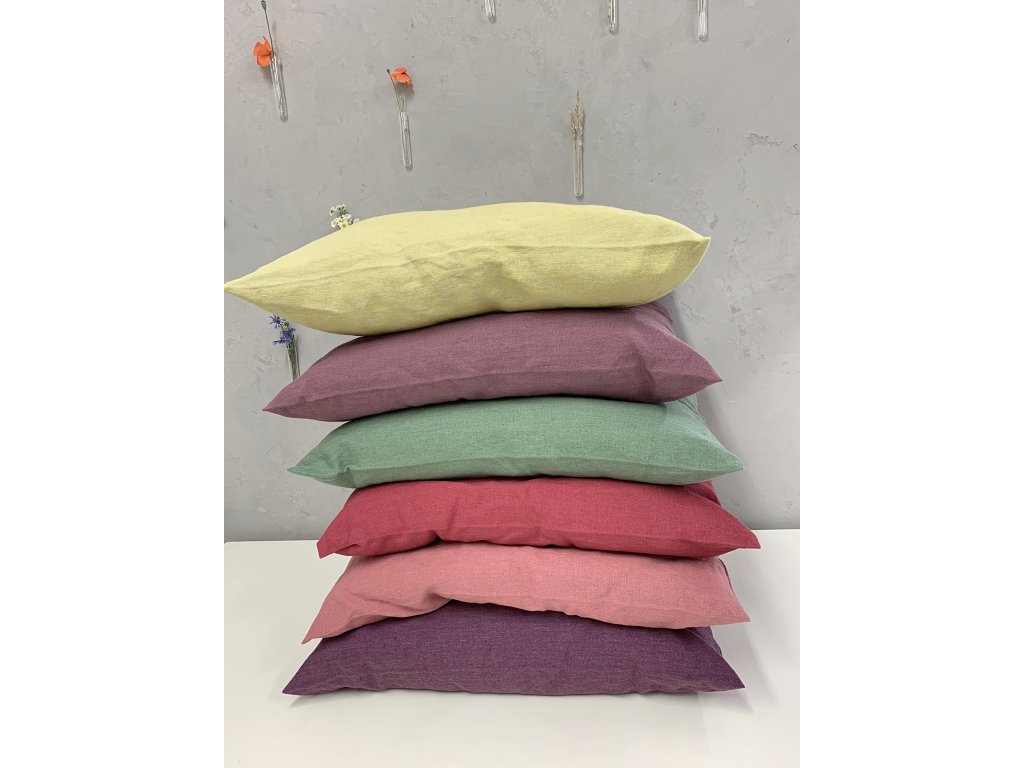 Materiálem je pevný 100% len s vysokou gramáži, ještě vyšší než používáme na klasické povlečení. Proto se ideálně hodí na pohovku v obývacím pokoji. Látky jsou luxusní a působí tak i na první dojem. Většina barev je protkávána více barvami nití, to má za výsledek krásné odlesky finální barvy.